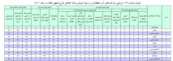 بر اساس گزارش شرکت مدیریت منابع آب ابران، ارزیابی عملکرد شرکتهای آب منطقه ای در این طرح در سال 1401 بر اساس معیارهای مختلفی نظیر تعداد و کیفیت قراردادهای بسته شده، نحوه تعامل با مشاور راهبر، نحوه هزینه کرد و جذب اعتبارات، کمیت و کیفیت مطالعات انجام شده و تعداد نقاط تجهیز شده برای کنترل، پایش و نظارت صورت گرفته است.